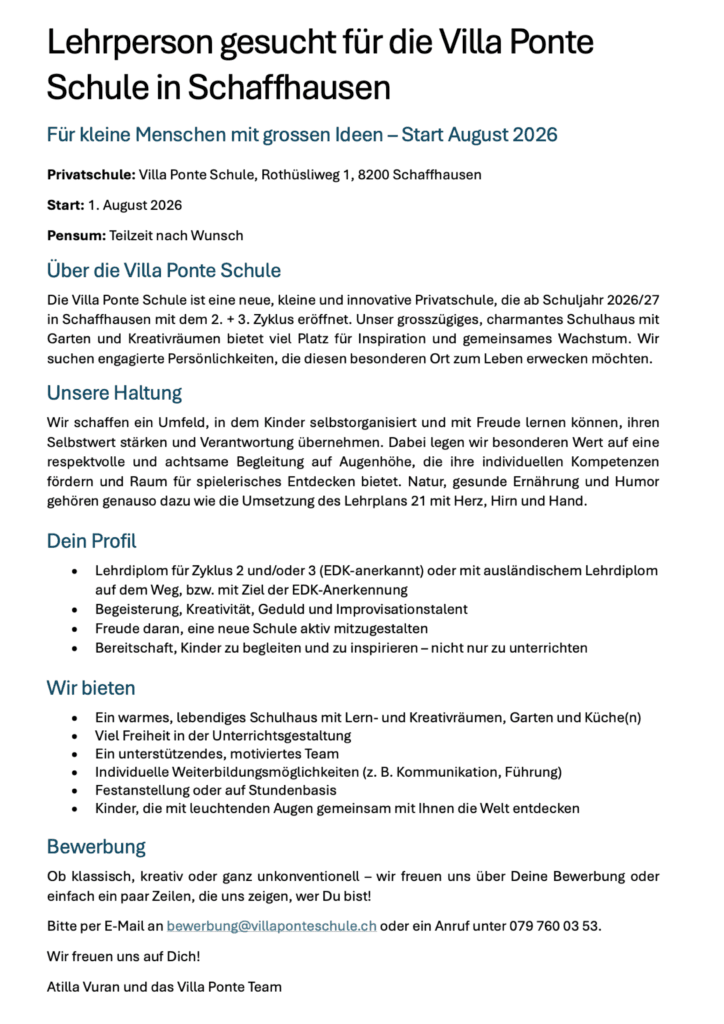 Im Sommer 2026 öffnet in Schaffhausen die Villa Ponte Schule ihre Türen – eine kleine, innovative Privatschule für Kinder im 2. und 3. Zyklus. In einem grosszügigen Haus mit Garten schaffen wir einen Ort, an dem Kinder selbstorganisiert, mit Freude und in Beziehung lernen dürfen.